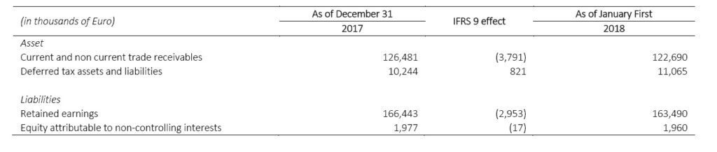 The Group has applied the simplified approach envisaged by IFRS9 in order to asses the recoverability of its own trade receivables. The adjustment to the estimates done before, as shown in the following table with values as at January 1 2018, takes into account the default risk in trade receivables, through a differentiated “ expected default rate” which is applied to classes of trade receivables homogeneous in terms of risk profile and maturity or, for those in arrears, in terms of the actions taken to recover the credit. Please see also Note 3 “Management of Financial Risks”.