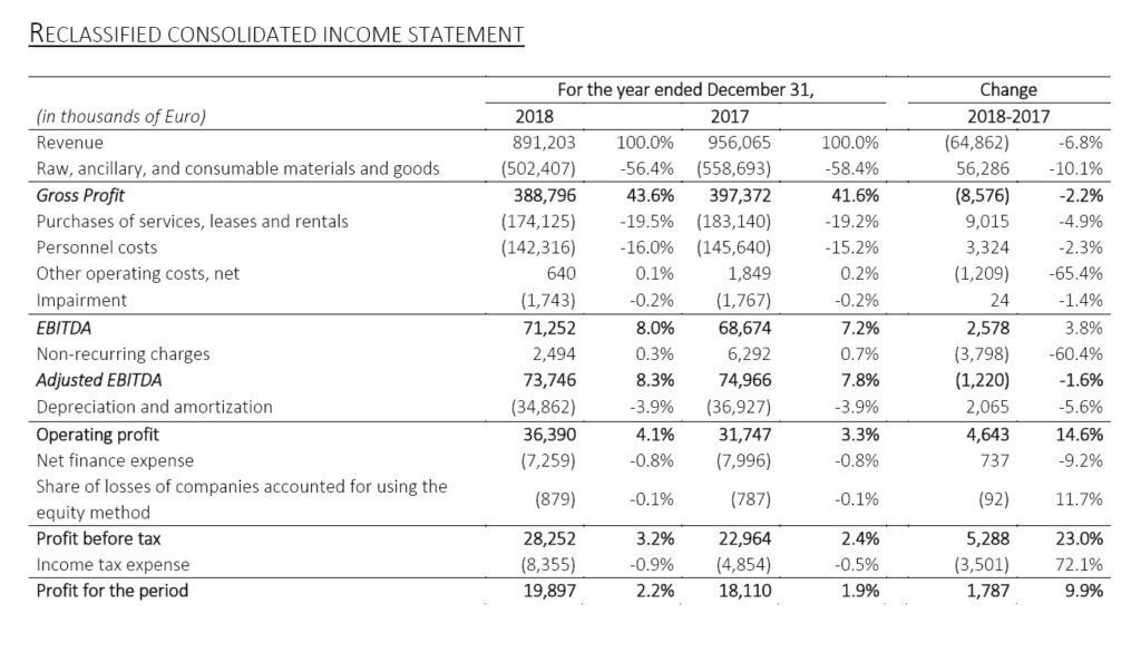 EBITDA adjusted amounts to Euro 73.7 million (8.3% on revenue) compared with 75.0 million of 2017 (7.8% on revenues) a decrease of 1.6% at current FX. Excluding the negative impact of exchange rate fluctuations for Euro 1.2 million, EBITDA adjusted was stable compared with 2017. In the third and fourth quarter, the Group launched different projects aimed at further streamlining of business operations in Europe, which generated non-recurring charges of Euro 2.5 million.