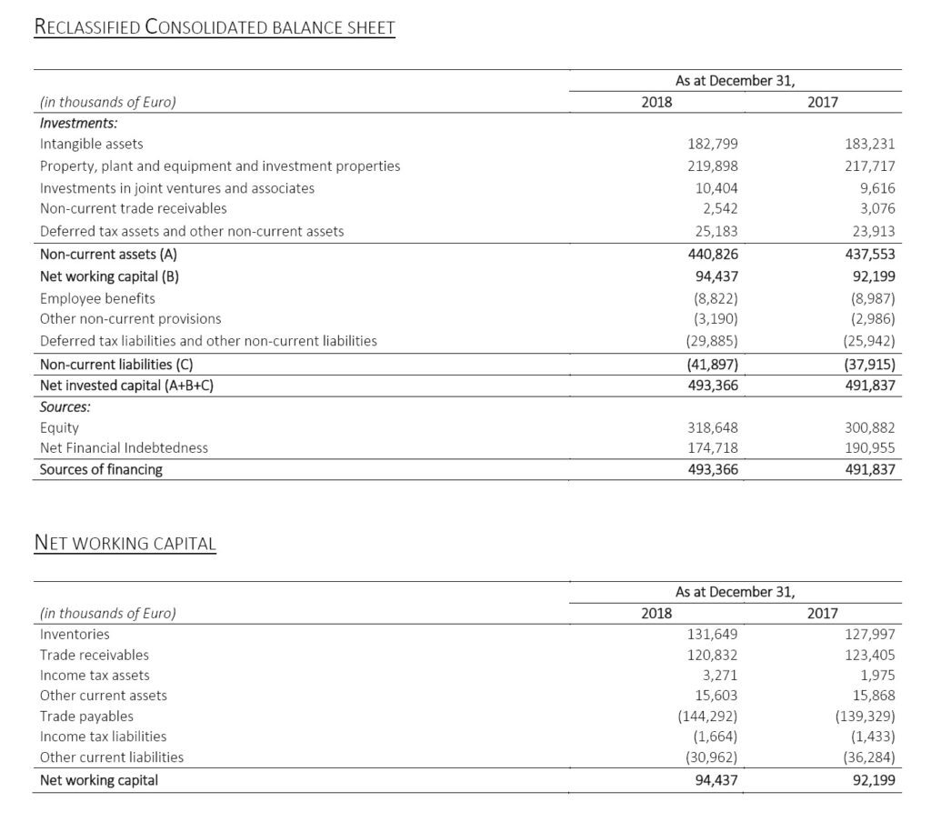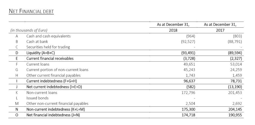 Net debt is equal to Euro 174.7 million, compared to 191.0 million at December 31, 2017. During 2018, the net recurring investments amount to Euro 31.6 million compared to Euro 34.9 million of 2017. During the period, Euro 6.0 million dividends were distributed, compared with Euro 5.3 million of the same period of 2017.