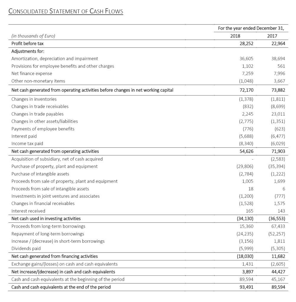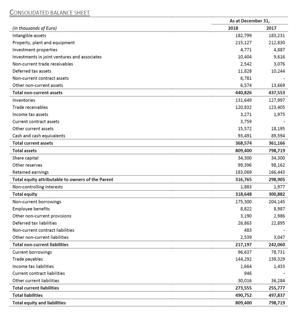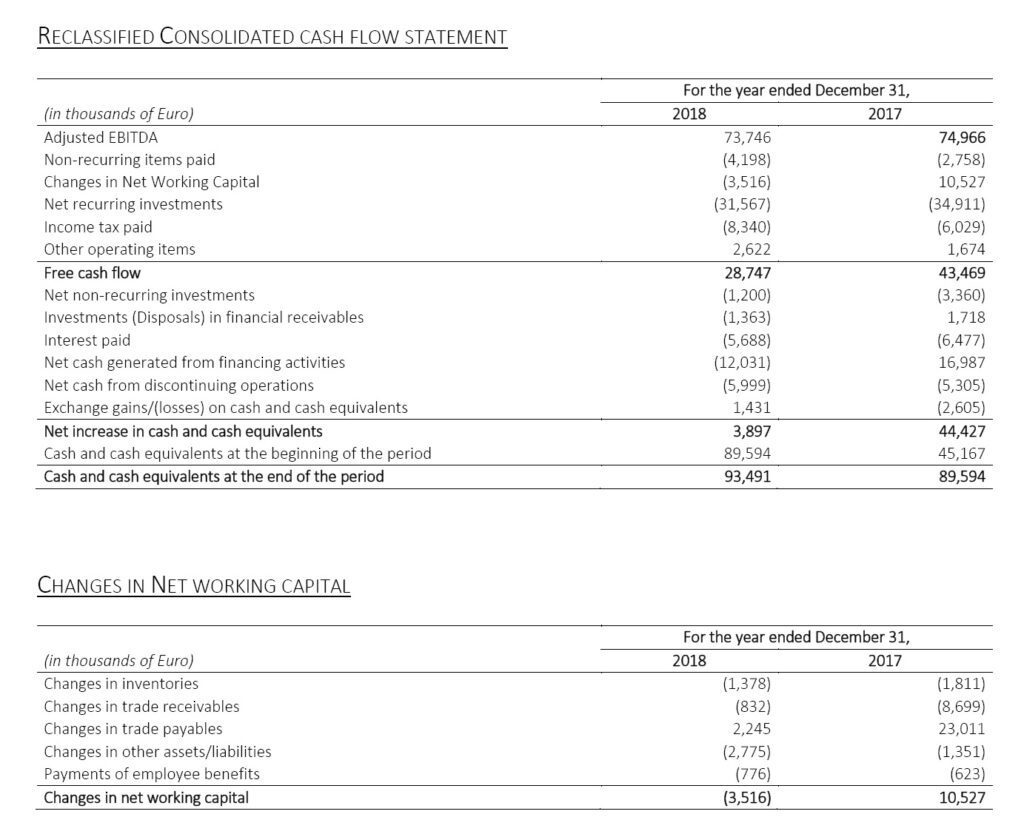 2019 will also be a year rich in projects, in which we expect to reap the rewards of the initiatives launched this year, in order to achieve profitable and lasting growth. Business performance and efficient management of working capital allowed the Group to generate cash flows of over 60 million, before investments equal to Euro 32 million. Based on the results obtained and the positive expectations for the current year, we propose to the next Shareholders’ Meeting the distribution of a gross dividend of Euro 0.19 per share, up by 12% compared to last year.”