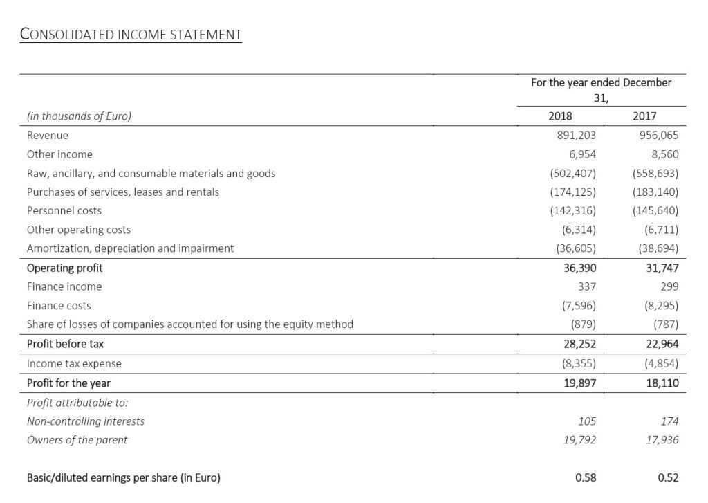 The net profit amounts to Euro 19.9 million, up 9.9% compared to 2017.