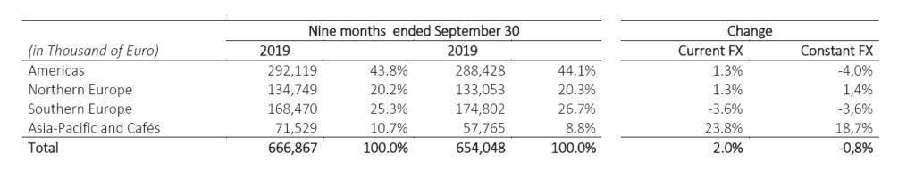 Asia-Pacific and Cafés, which also includes the revenue generated by the international network of cafés, posted revenue of Euro 71.5 million, with a growth of 18.7% at constant exchange rates compared with the nine months of 2018, also reflecting the recent acquisition of the Australian BAG.