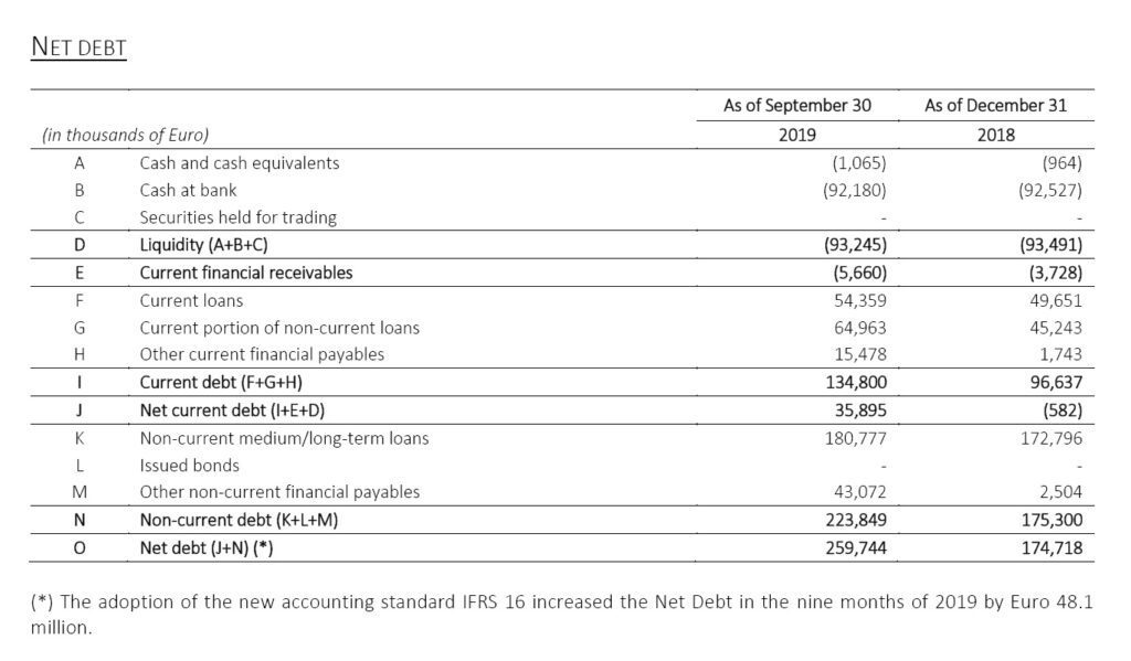Lastly, the adoption of the new accounting standard IFRS 16 increased the Net Debt by Euro 48.1 million. As a result, the Net Debt as of September 30, 2019, after the adoption of IFRS 16, amounted to Euro 259.7 million.
