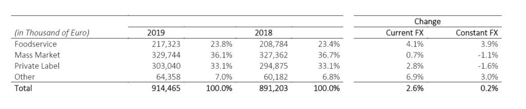 Mass Market increased 0.7% at current forex (-1.1% at constant FX) compared with 2018. The channel showed a progressive improvement in all the geographical areas in the last quarter (+6.8% compared to the fourth quarter of 2018), after a first half negatively affected by the weakness of the Americas and the timing effect of the introduction of the renewed Segafredo product range in Italy.