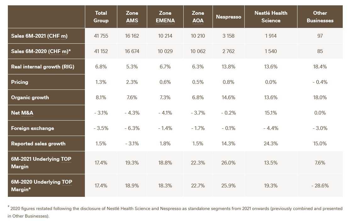 VEVEY, Switzerland – Nestlé reported today half-year results for 2021 and raised full-year organic sales growth guidance. Organic growth reached 8.1%, with real internal growth (RIG) of 6.8% and pricing of 1.3%. Growth was supported by continued momentum in retail sales, a return to growth in out-of-home channels, increased pricing and market share gains. Total reported sales increased by 1.5% to CHF 41.8 billion (6M-2020: CHF 41.2 billion), or US$45.7 billion. Foreign exchange reduced sales by 3.5%, reflecting appreciation of the Swiss franc against most currencies. Net divestitures had a negative impact of 3.1%.