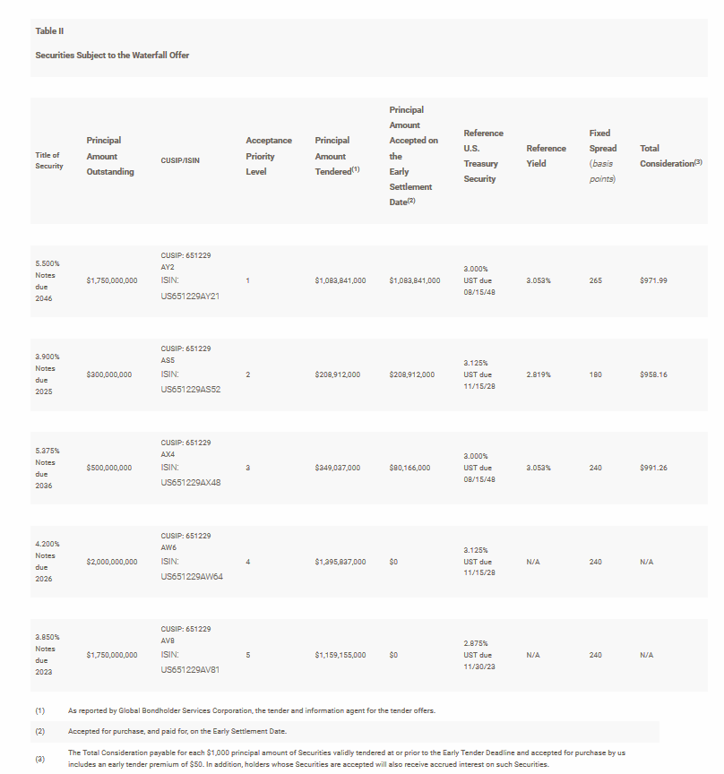 As listed in the tables above, on December 26, 2018 (the “Early Settlement Date”), the Company accepted for purchase, and paid for, $252,081,000 aggregate principal amount of its 3.150% Notes due 2021, $1,083,841,000 aggregate principal amount of its 5.500% Notes due 2046, $208,912,000 aggregate principal amount of its 3.900% Notes due 2025 and $80,166,000 aggregate principal amount of its 5.375% Notes due 2036 which had been validly tendered and not properly withdrawn at or prior to the Early Tender Deadline.