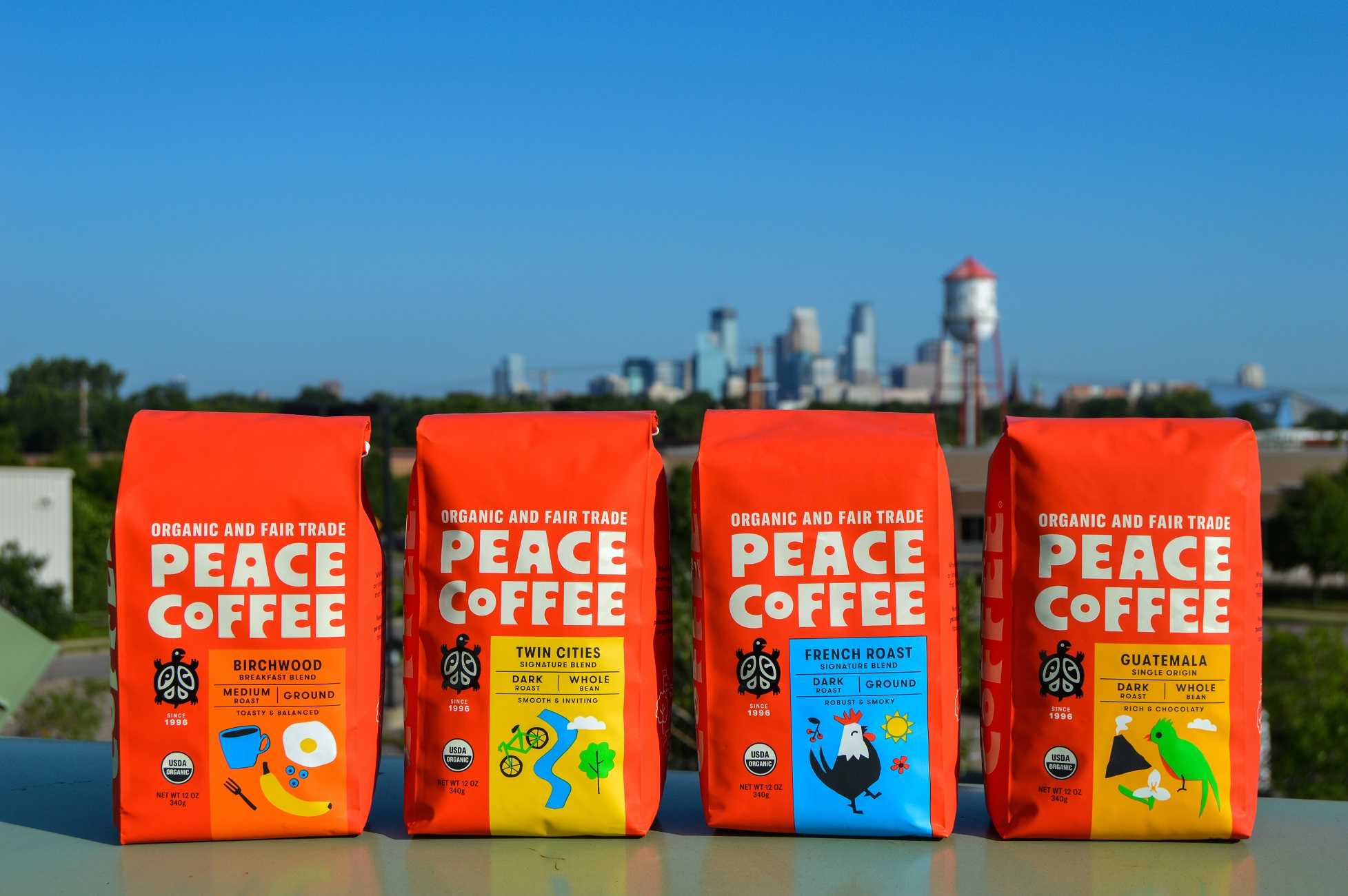 Twelve ounce bags of Peace Coffee’s Birchwood, Twin Cities, French Roast and Guatemala blends are available for a suggested price of $11.99; 20 ounce bags are available for a suggested price of $18.99.