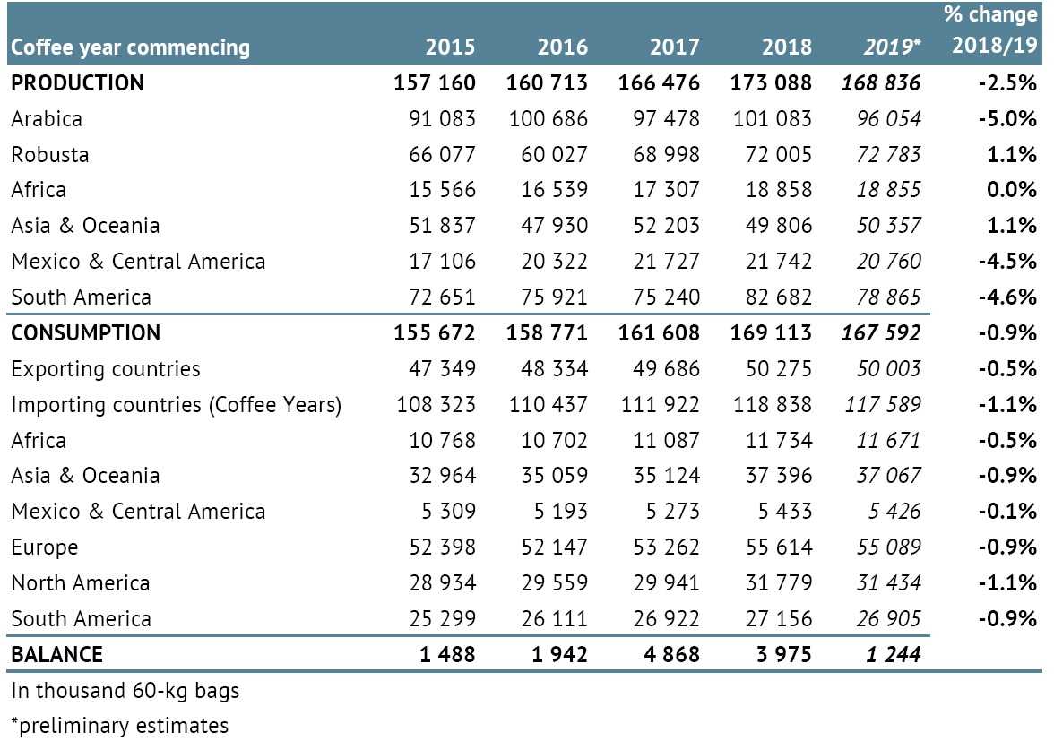 Global coffee production in 2019/20 is estimated at 168.84 million bags, 2.5% lower than last year, while world coffee consumption is estimated to decrease by 0.9% to 167.59 million bags, resulting in a surplus of 1.24 million bags.