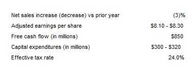 Adjusted earnings per share is expected to range from $8.10 to $8.30, based on 114.0 million shares outstanding. Earnings guidance reflects the contribution from sales at a gross profit margin of approximately 38.2 percent, SD&A expenses declining approximately 2.5 percent compared to the prior year, and an effective tax rate of 24.0 percent. Free cash flow is expected to be approximately $850 million.