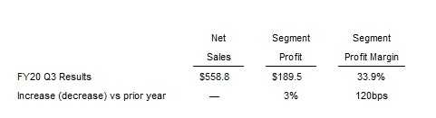 - The Company reaffirmed its full-year fiscal 2020 net sales, adjusted earnings per share, and free cash flow outlook.