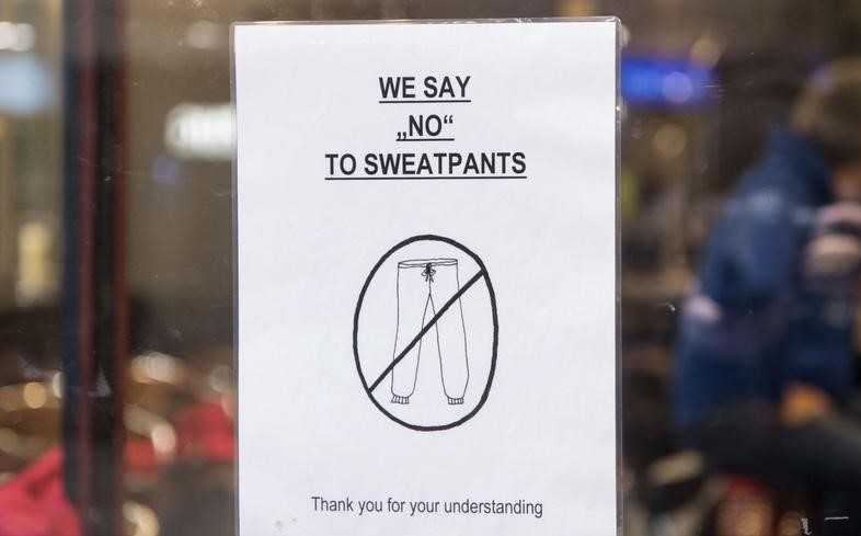 A sign posted on the door of the Le Theatre cafe in the southwestern German city depicts a picture of sweatpants crossed-out, accompanied by the words: “We say ‘No’ to Sweatpants.”