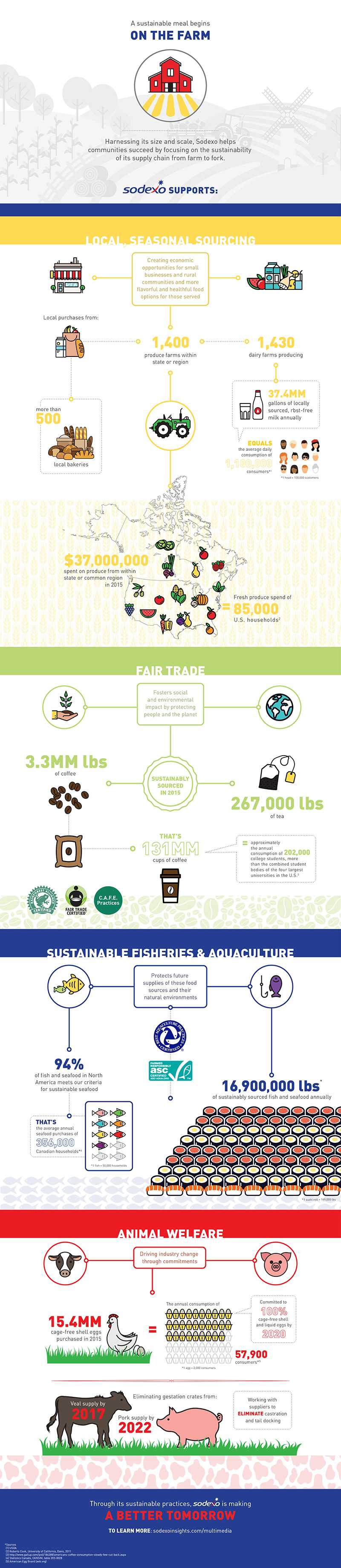 Sodexo’s sustainable supply chain focuses on four key practice areas; Local sourcing, Fairly traded products, sustainable seafood and animal welfare. Local, seasonal sourcing allows Sodexo to create economic opportunities for small businesses and rural communities, while offering more flavorful and healthful food options for customers every day.