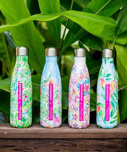 Each of the four new 17-ounce Lilly Pulitzer S’well bottles is available at Starbucks for $39.99, starting February 15.