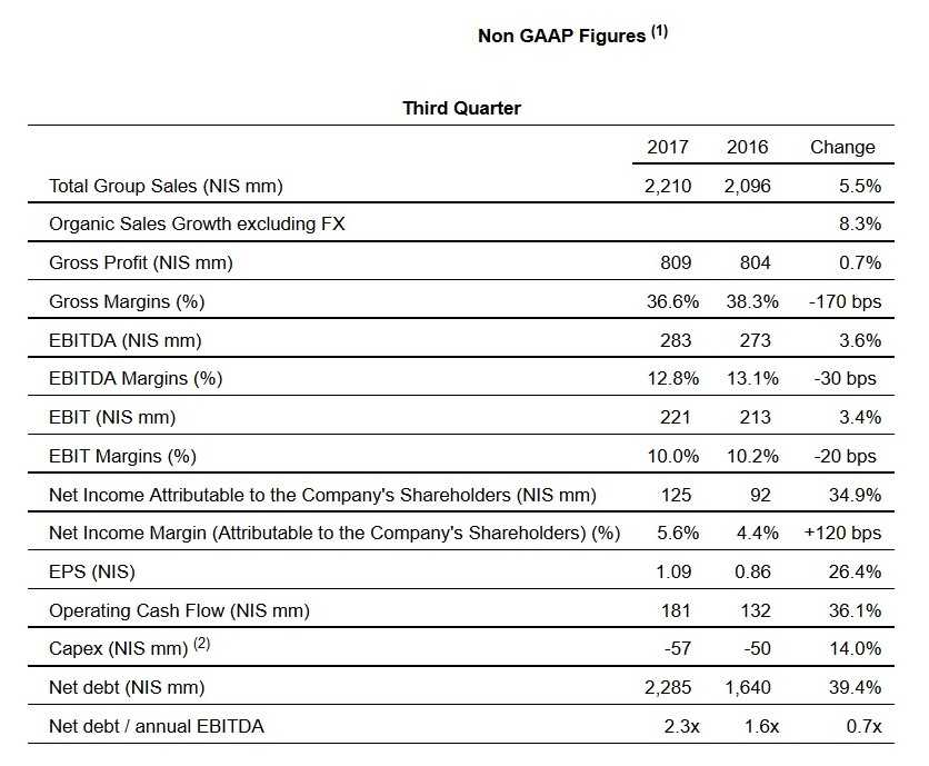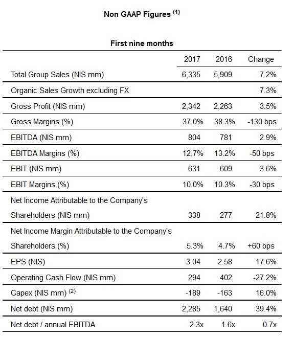 - Strong organic sales growth, excluding foreign exchange effects, was c8.3%. Shekel sales were NIS c2.2 billion compared to NIS 2.1 billion in the corresponding prior-year period; sales were impacted by negative foreign currency translation amounting to NIS c34 million, mainly as a result of the weakening of the BRL against the NIS compared to the corresponding period.
