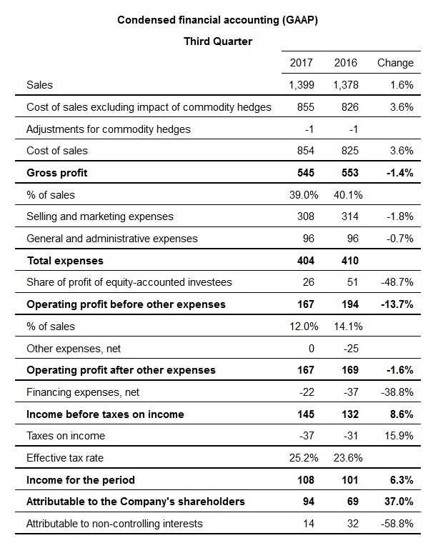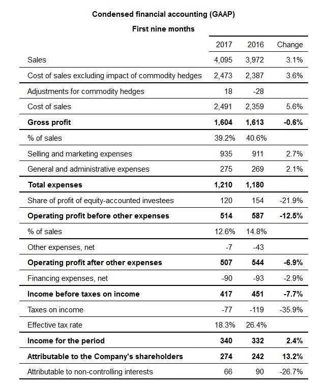 (1) Based on the Company’s non-GAAP figures, which include the proportionate consolidation of jointly controlled businesses (without implementation of IFRS 11) and do not include share-based payment, valuation of the balance of commodity hedging transactions as at end-of-period, including adjustments required for deferral of profit or loss from commodity derivatives until the inventory is sold to external parties, and other income and expenses, net, unless stated otherwise.