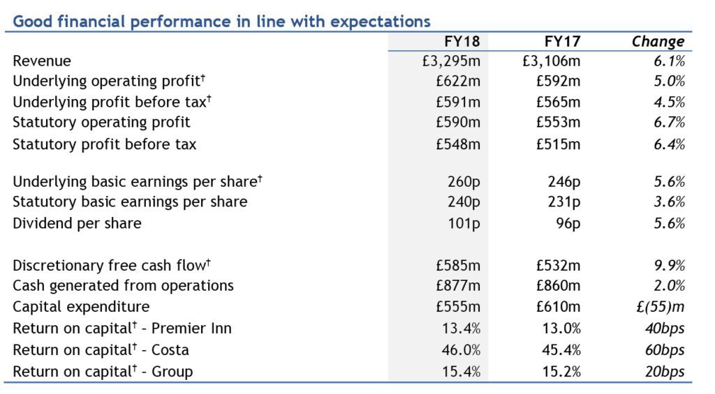 - Premier Inn underlying operating profit growth to £498 million, Costa increased to £159 million