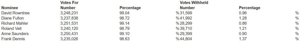 PricewaterhouseCoopers LLP was appointed as auditors with 99.80% voting support.