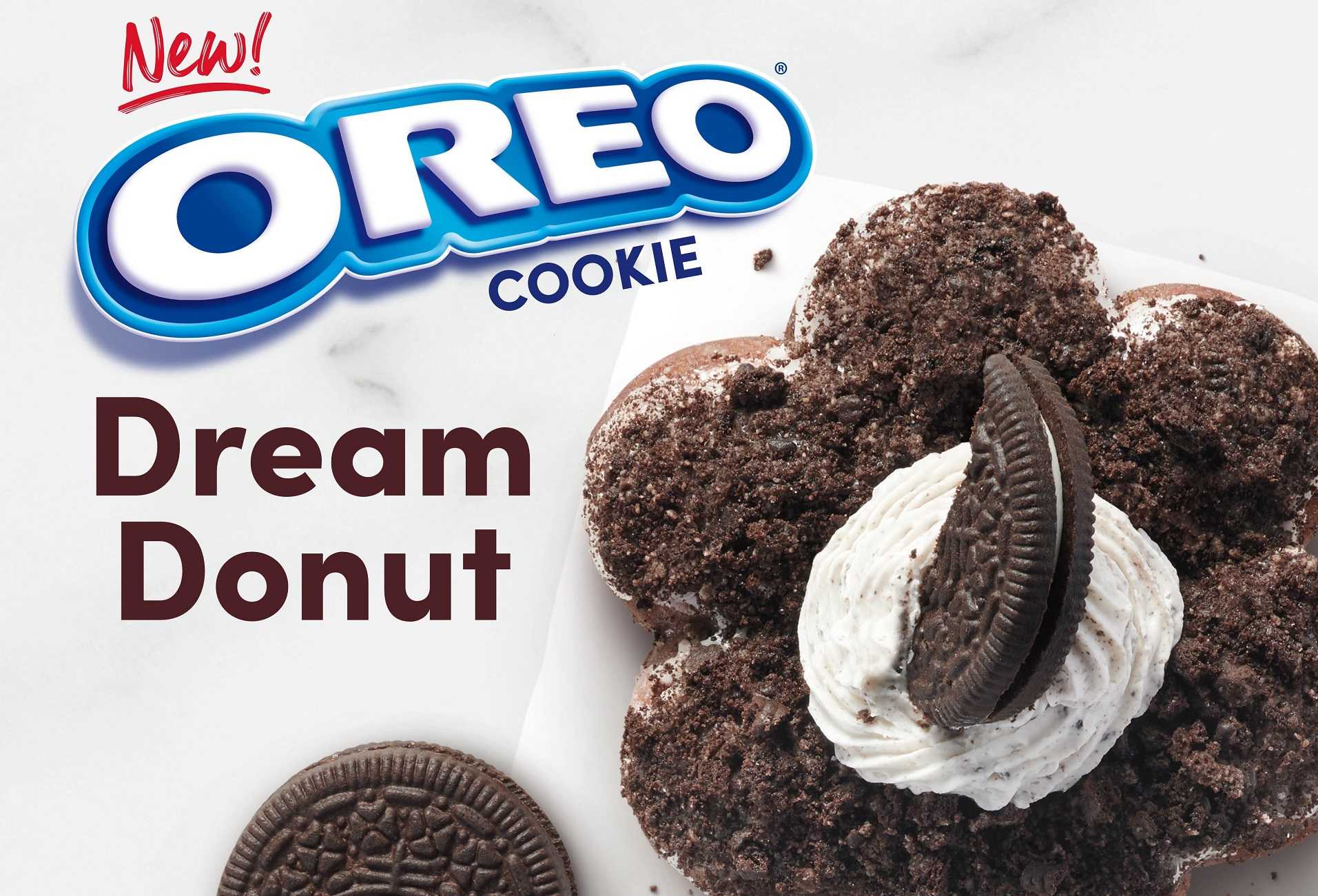 - Oreo® Cookie Dream Donut: a cookies & cream style donut featuring OREO cookie pieces and a vanilla fluff icing swirl on white fondant, topped with an OREO cookie half