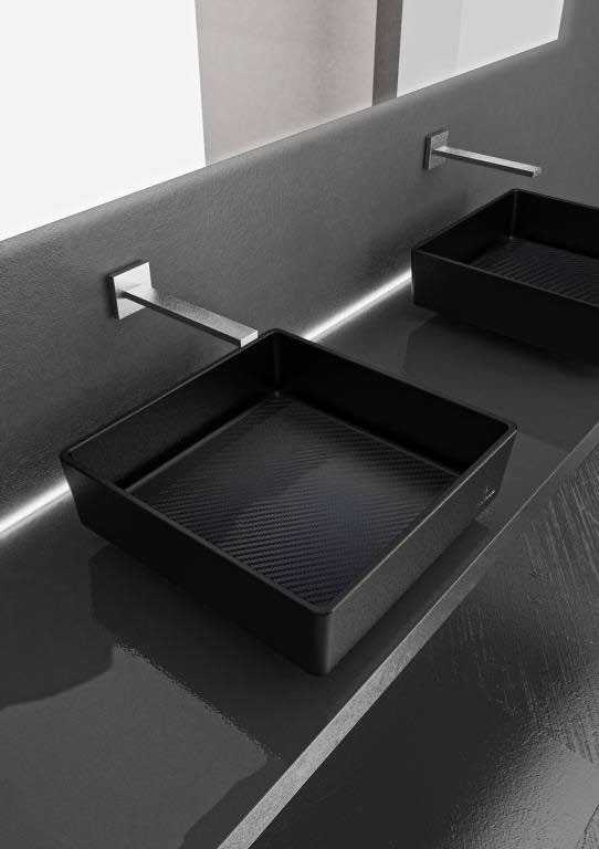 Proposed in square and rectangular versions, they are available in white, black and gray finishes, which have always been synonymous with absolute class and elegance. The internal carbon finish plays a de-cisive role, allowing the light to create a synergy with the basin itself, showing the geometries in the purest and most essential way.