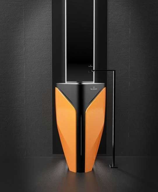 Unconventional, captivating, one-of-a-kind. Iconico is a freestanding washbasin with an impressive presence and a strong character. Inspired by the Heritage of Tonino Lamborghini, Iconico stands out for its soft edges. Fashioned from VetroFreddo, features a bicolour structure with an inner black core and coloured external details.