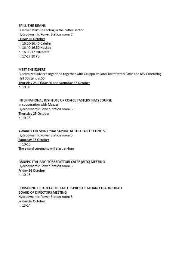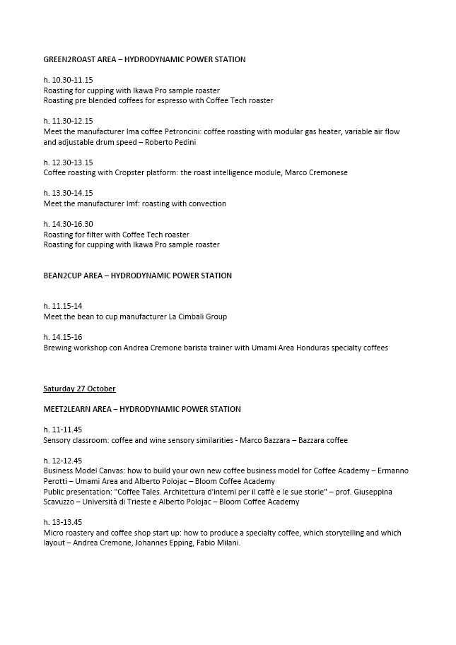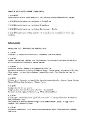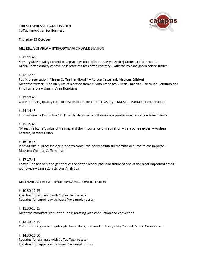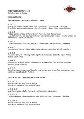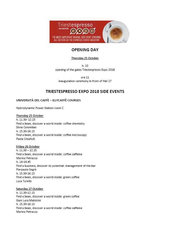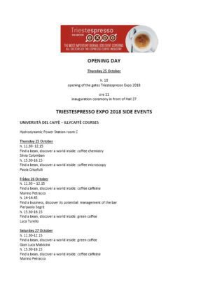 «There are two key words in the 2018 edition: ‘Training’ and ‘innovation’. Key words that we will find on all three days of the fair: from the courses organized by the University of coffee – illycaffè to the many appointments of Triestespresso Campus, from personalized consultations dedicated to food safety to courses for becoming tasters, from insights on corporate social responsibility to the presentation of four innovative startups, ready to make their way in the coffee sector».