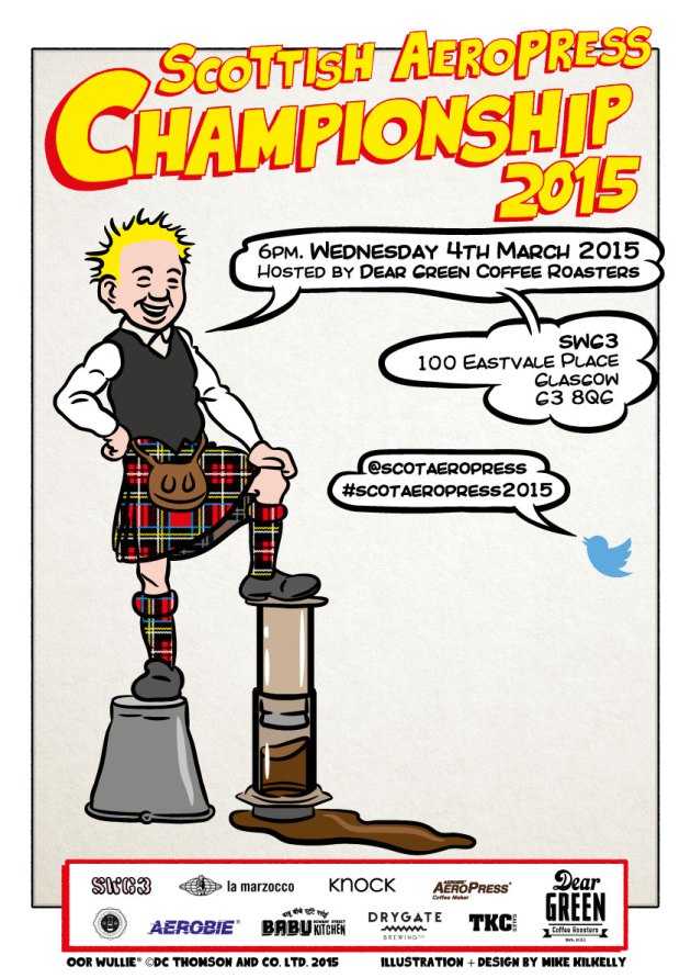 The 2015 Scottish Aeropress Championship is sponsored by: La Marzocco, Dear Green Coffee Roasters, Knock, SWG3, Drygate Brewing Co, Aerobie, TKC Sales, Marco Beverage Systems.
