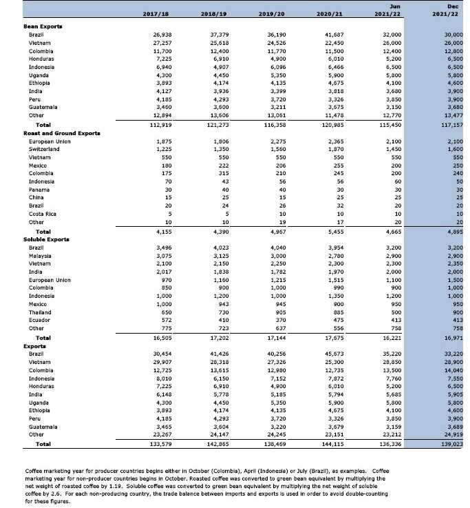 WASHINGTON, USA – The USDA ‘s “Coffee: World Markets and Trade” report forecasts world coffee production for 2021/22 down 8.5 million bags from the previous year to 167.5 million, due primarily to Brazil’s combined effect of Arabica trees entering the off‐year of the biennial production cycle and a weather‐related shortfall.