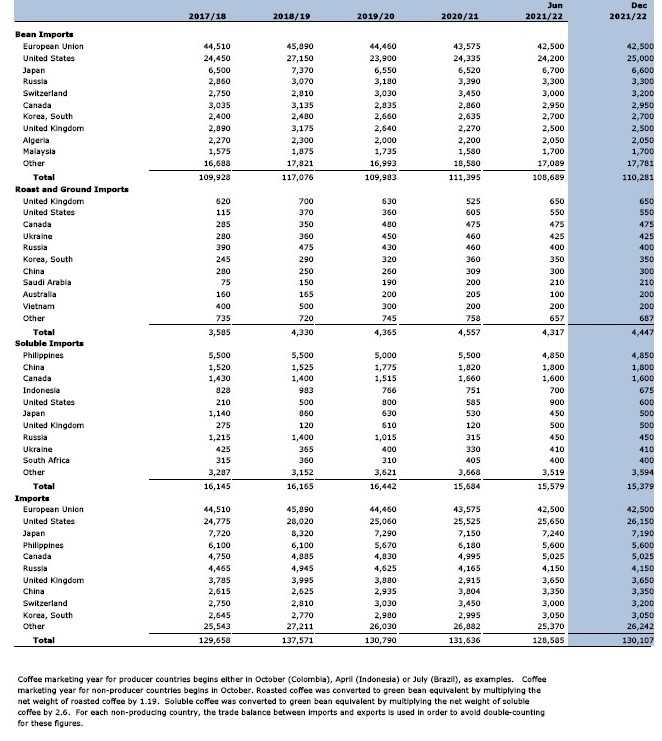 - European Union is revised 2.3 million bags lower to 13.8 million on updated data from the European Coffee Federation.