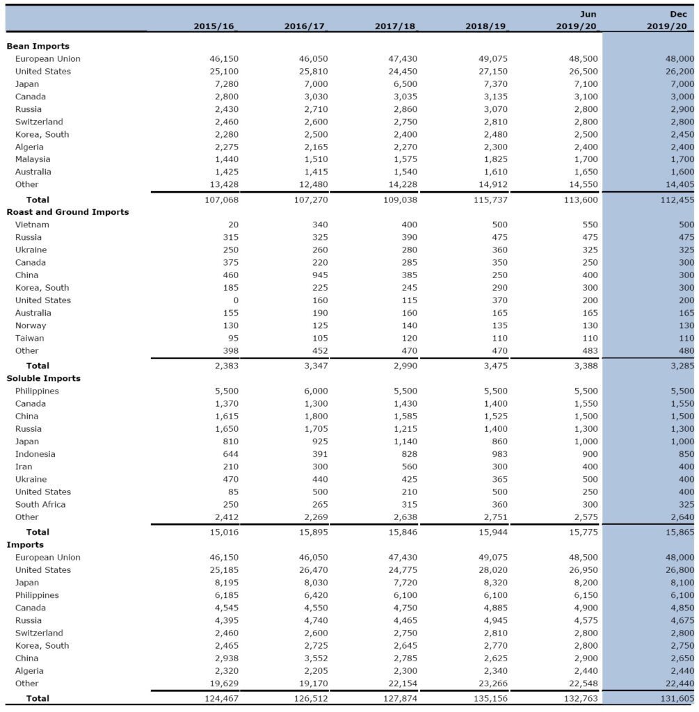 MILAN – The United States Department of Agriculture (Usda) released on Friday its biannual report “Coffee: World Markets and Trade” containing the official estimates on production and consumption. World coffee production for 2019/20 is forecast 5.3 million bags (60 kilograms) lower than the previous year to 169.3 million, primarily due to Brazil’s Arabica trees entering the off-year of the biennial production cycle.